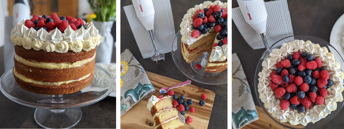 - Repeat with the second sponge so you end up with two layers of custard and jelly with the top ready for the cream, meringue, and fruit.